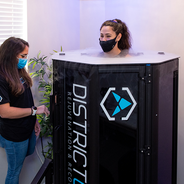 District Cryo: Each cryo session is three minutes long. Clients wear gloves, shoes and socks. Men and women can get undressed or be dressed to a certain comfort level. Before each client enters the cryo chamber, we establish why they’re going in. They will feel some relief or total relief in a certain area upon completion. Afterwards, we ask the client how the particular area feels, and 9 times out of 10 they say they feel nothing, which is the exact goal. Our clients come to us year-round. Some come in 5-7 times per week, it depends on their situation. Clients ask us how often they should come in and we ask them how often they want to come in. We don’t want to add any additional stress to their lives. However, 90% of our clients come in multiple times per week.