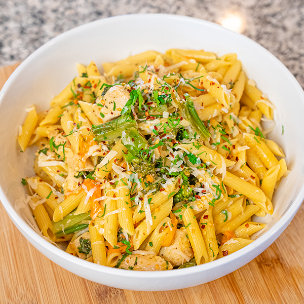 [/vc_column_text][ultimate_spacer height=”20″][vc_column_text]Our Executive Chef and Co-founder, Stefano Marzano, has done it again with another easy-to-make, healthy chicken breast recipe under 500 calories per serving! This Roasted Garlic Chicken Pasta Recipe feeds six people. It’s packed with 36G of lean protein and only has 10G of total fat per serving. It uses MightyMeals’ prepared bulk chicken and broccolini ingredients, making ingredient prep easy by using MightyMeals at home.